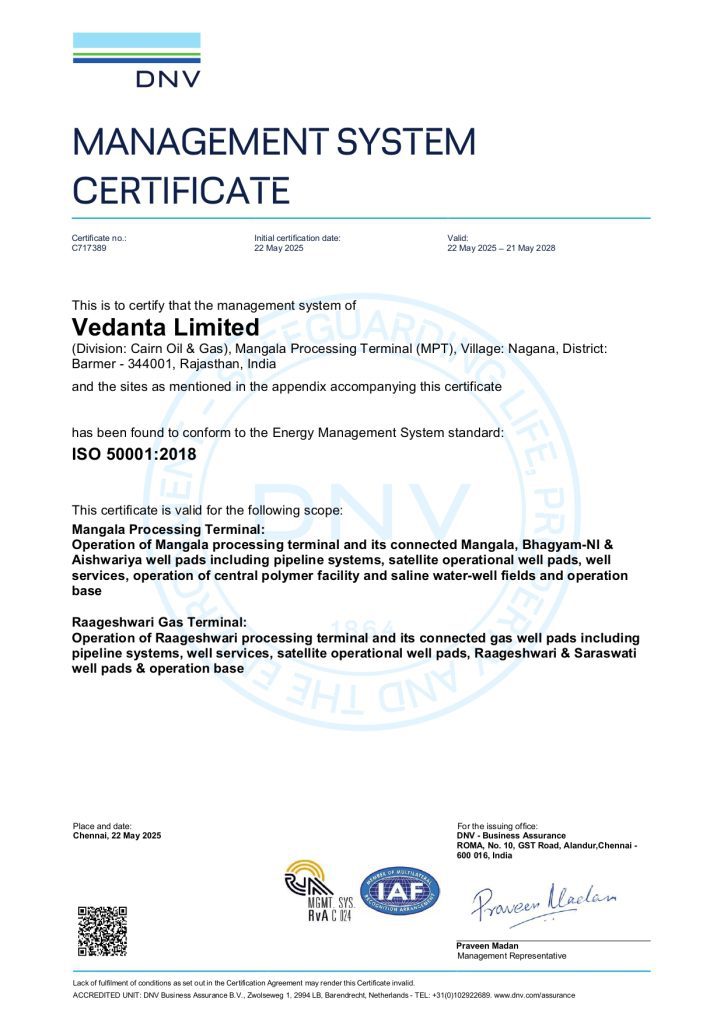 As the energy industry moves toward more responsible and efficient operations, setting high standards in sustainability has never been more important. Recognising this, we continue to push the boundaries of operational excellence. We are pleased to share that RJ Assets encompassing both RJ North and RJ South has been officially awarded the ISO 50001- Energy Management System certification. This recognition marks a significant step forward in our journey towards operational excellence and environmental responsibility. It underscores our ongoing commitment to energy efficiency, sustainability and the adoption of best-in-class practices across the asset.